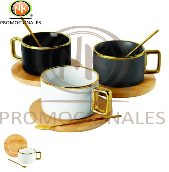 Descripción: " Taza de cerámica Promocional con base de bambú y cuchara metálica dorada. Terminado mate con detalle dorado en filo y asa.Material Cerámica / Bambú. Medida 9.2 x 6.3 cm Taza / 13.8 cm Diámetro Base. Capacidad 9 Oz"