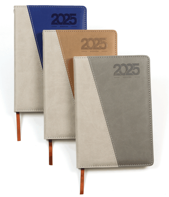 Descripción: Set de Agenda diaria 2025 bi-tono con pluma y caja de regalo. Cubierta bi-tono fabricada en curpiel (PU) e interior de 175 hojas de 65 g. (350 paginas) Cada día tiene espacio para tareas importantes y está organizada por horario (5:00 am 22:00 pm). Cuenta con: Separador de hojas, calendario anual 2023-2025, planeador mensual, hoja de objetivos anuales, hoja de pendientes mensuales, espacio para notas, tareas, sección de contactos y bolsillo interno para almacenar documentos. Bolígrafo con detalle de bambú en la parte inferior, clip y punta metálicos y con touch en la parte superior. Incluye caja de cartón individual y bolígrafo con tinta de escritura negra.Medidas: 21.3x15 cm.