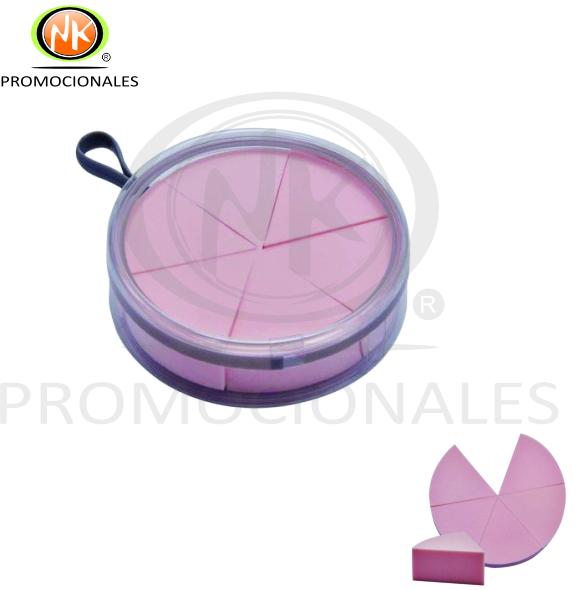 Descripción: " Estuche Promocional con 6 esponjas para maquillaje. Las esponjas tienen forma de cuña para una fácil aplicación de maquillaje o corrector líquido y en crema. Tienen una textura suave y absorbente al agua. Pueden utilizarse húmedas o en seco.Material Algodón / Plástico. Medida 8.3 cm Diámetro"