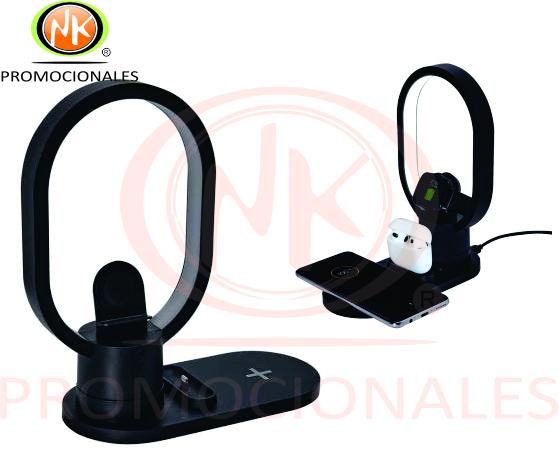 Descripción: Cargadior con lampara Promocional con base con cargador inalámbrico para smartphone, cargador inalámbrico para reloj inteligente, cargador para earbuds y lámpara de noche con luz cálida. Velocidad de carga de 5W / 7.5W / 10W / 15 W. Base giratoria con touch para encender la lámpara. Compatibles con dispositivos que cuenten con tecnología de carga inalámbrica. Material Plástico. Medida 18.5 x 21.5 x 8.5 cm. Capacidad 15W