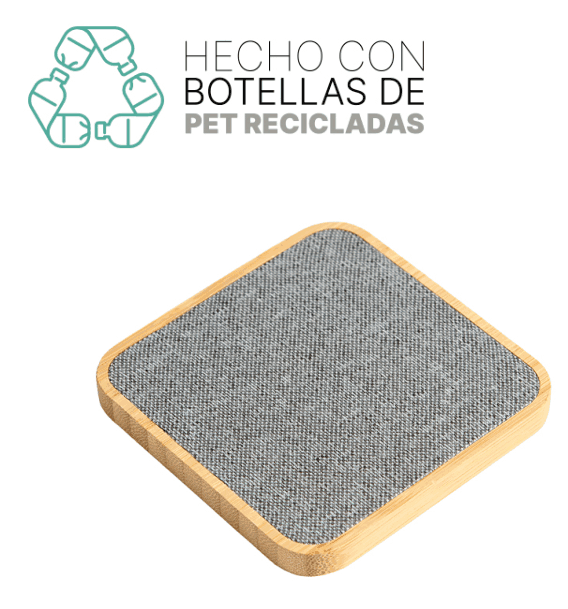Descripción: " Cargador inalámbrico fabricado en madera de bambú con forro de RPET. Potencia de carga de 10 W. Compatible con dispositivos con tecnología Qi. Medidas: 9.3x9.3 cm."