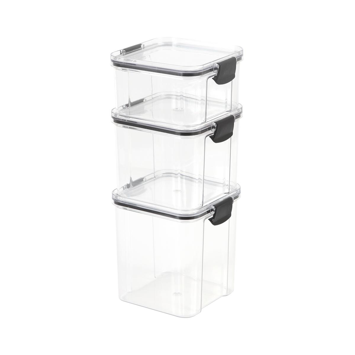 Descripción: "Set de tres contenedores para alimentos, fabricado en PET y polipropileno (PP). Con capacidades de 460 ml, 700 ml y 950 ml. Diseño especial para conservar y transportar alimentos. Medidas: 460 ml: 10.2x6.6 cm. | 700 ml: 10.2x9.5 cm. | 950 ml: 10.2x12.5 cm."
