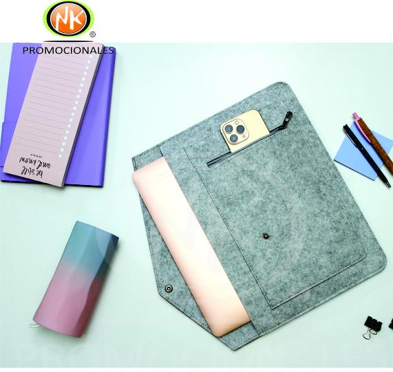 Descripción: "Funda para laptop fabricada en fieltro. Es una opción elegante y funcional para proteger y transportar tu laptop de manera segura, con un detalle de curpiel que agrega un toque de estilo. Cuenta con un bolsillo frontal con cierre, que ofrece un espacio conveniente para guardar accesorios esenciales. Medidas: 24x34 cm."