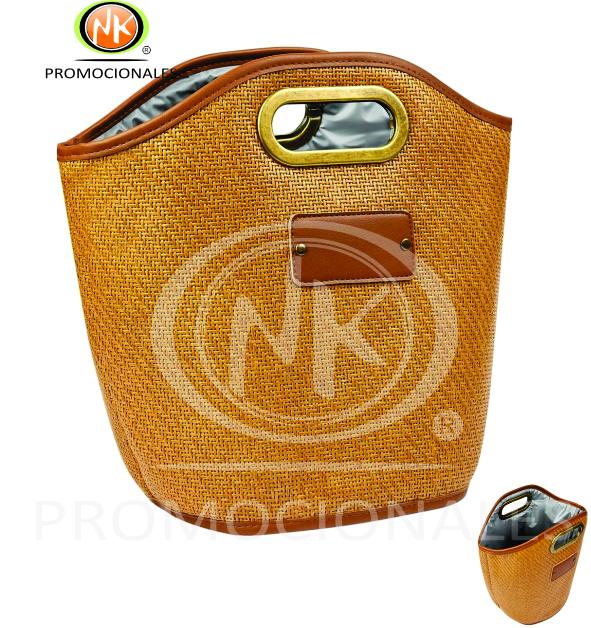 Descripción: " Hielera tipo bolsa con interior plastificado y sellado. Compartimento principal con diseño abierto. Asas con marco de metal. Capacidad para 12 latas. Material Tejido de Papel / Algodón. Medida 36 x 30.5 X 24 cm. Capacidad 7 Litros"