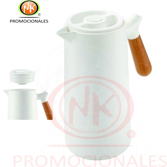 Descripción: Jarra térmica doble pared. Interior de vidrio y exterior de plástico. Tapa con botón dispensador y asa de bambú. Base removible con sistema de rosca que permite retirar fácilmente el interior para una mejor limpieza. Mantiene temperatura caliente y fría 6 hrs. Incluye caja individual.