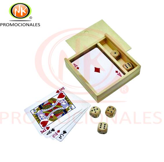 Descripción: " Set de juego Promocional que incluye una baraja, 5 dados y estuche de madera. Material Madera. Medida 10 x 10 cm"