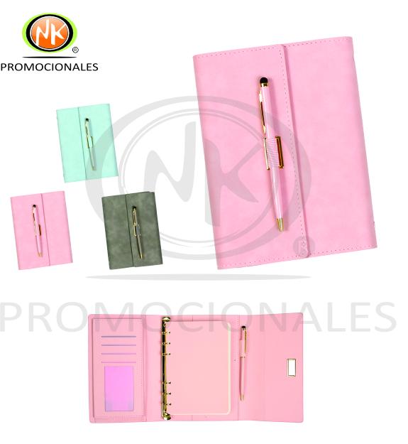 Descripción: Carpeta con exteriores en curpiel de alta calidad, con un diseño elegante y duradero. En su interior cuenta con 100 hojas removibles, aros en color dorado, espacio para tarjetas, documentos, y bolígrafo metálico a juego que ayuda a cerrar la carpeta. Incluye caja de cartón individual Con este set de carpeta de curpiel y bolígrafo metálico a juego, tendrás todo lo necesario para organizarte y escribir de manera elegante. Medidas: 19.2x14.5 cm.