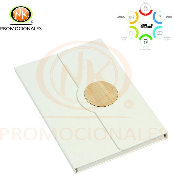 Descripción: Libreta Promoional fabricada en milk paper (cartones reciclados de leche) lo que la hace amigable con el medio ambiente y cartón, con pasta rígida y detalle de bambú en la pasta. 80 hojas rayadas de 80 g, con separador de hojas. Tamaño A5. Medidas: 21x16.3 cm.