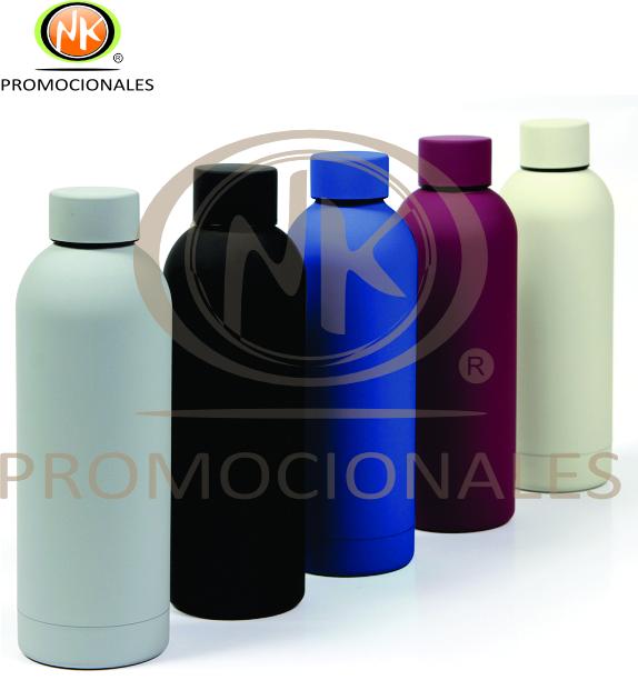 Descripción: "Botella de acero inoxidable doble pared con tapa de rosca y acabado tipo rubber. Su diseño es sofisticado y moderno, incorporando un acabado tipo rubber en su exterior que no solo le confiere un aspecto contemporáneo, sino que también proporciona un agarre cómodo, seguro y agradable al tacto. Esta característica se suma a su tapa de rosca, la cual evita posibles derrames. Está fabricado en materiales de grado alimenticio y el acero inoxidable permite mantener tus bebidas frías o calientes por un largo tiempo. No usar en microondas. Capacidad de 500 ml, Incluye caja individual"