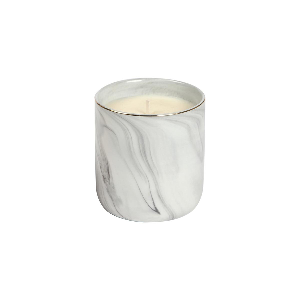 Descripción: Vela aromática con contenedor de cerámica con apariencia mármol, con un delicado detalle dorado en la parte superior, Concentración del 5 % de esencia con aroma a fresa. Su diseño sofisticado hace que sea ideal tanto para el uso en hogares como en ambientes profesionales, como salones de spa, oficinas o boutiques. Incluye caja de cartón individua. Medidas: 9.1x8.2 cm.